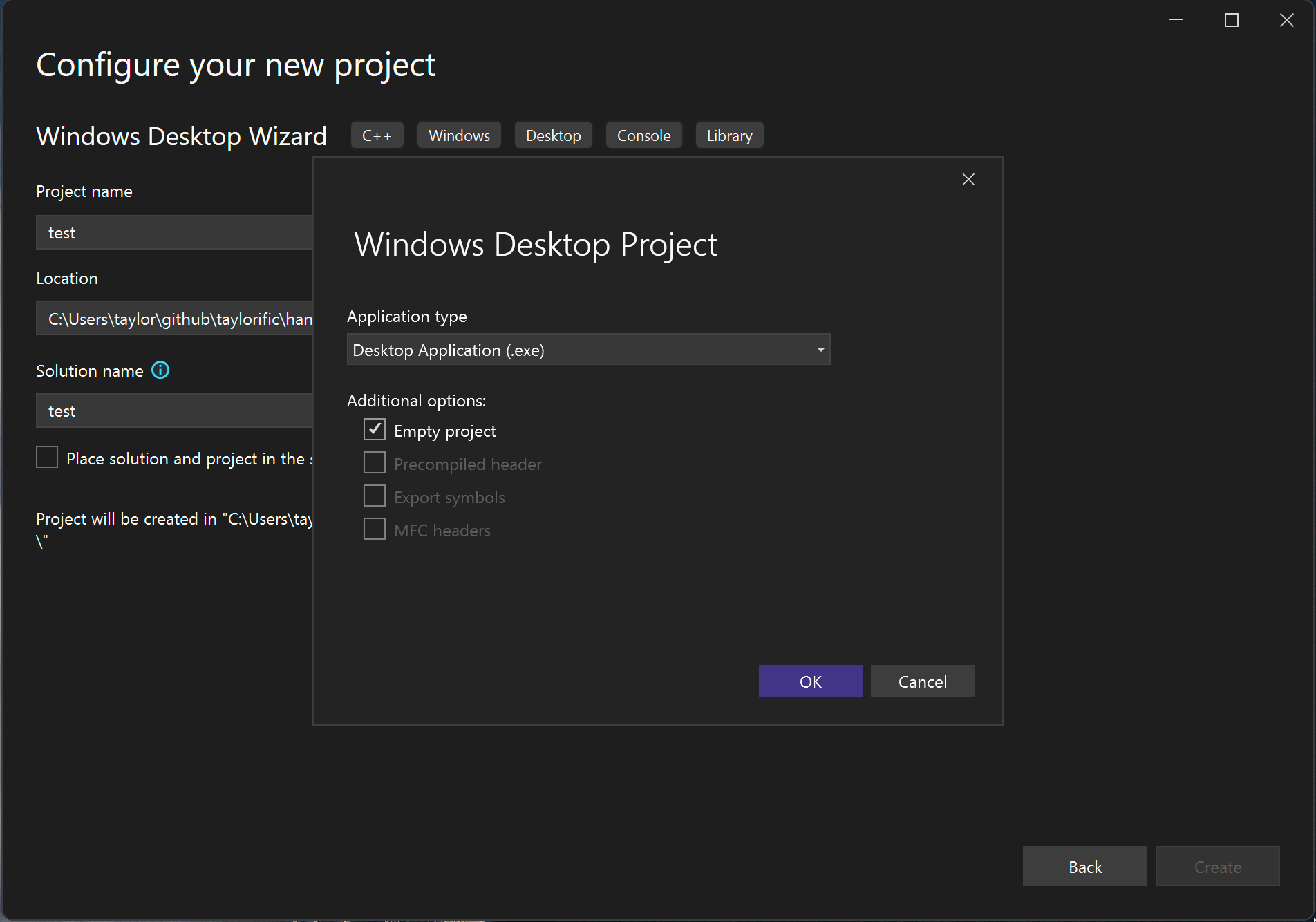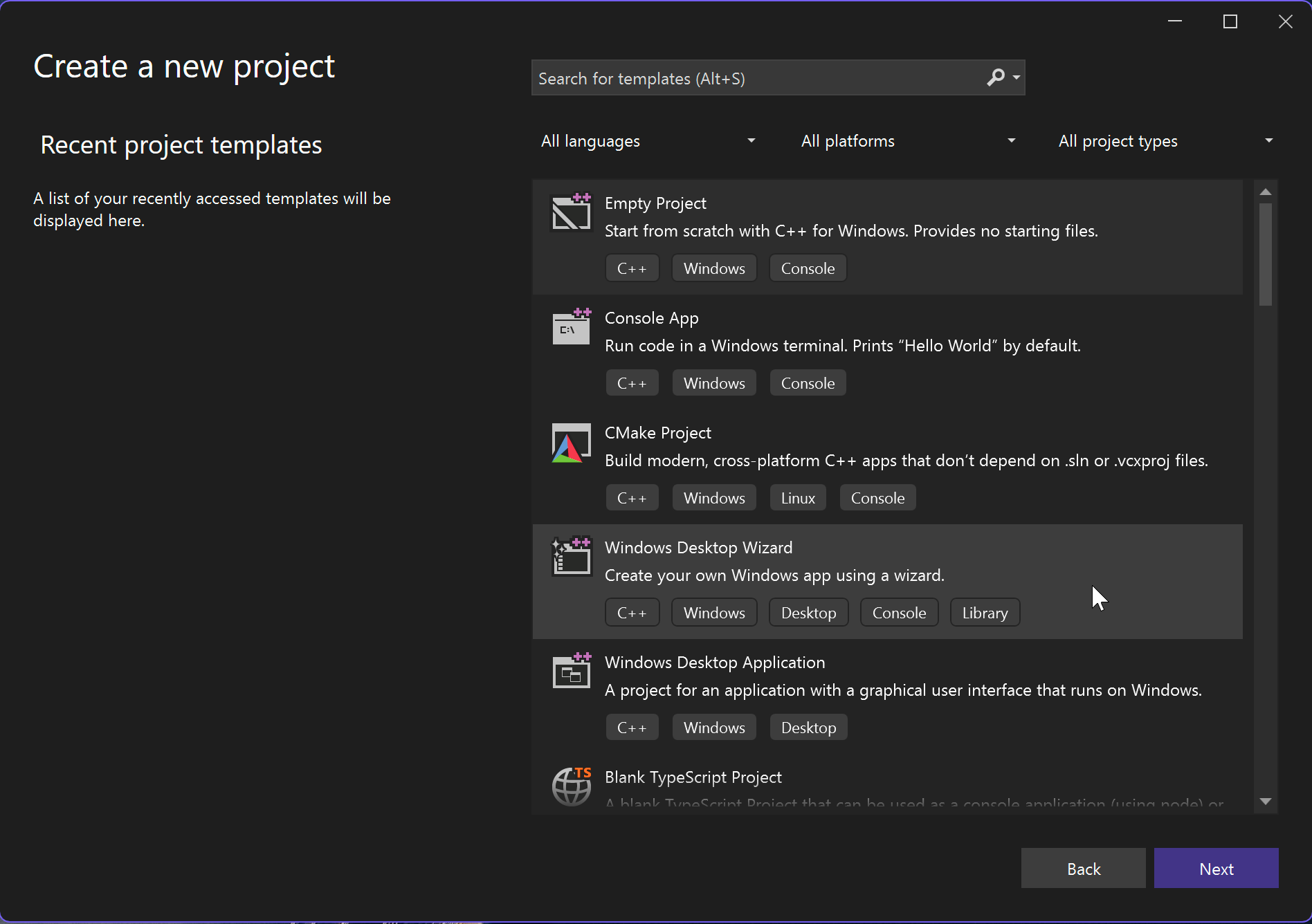 - When creating a new project choose "Windows Desktop Wizard" to ensure you get prompted to be able to choose an empty desktop project.