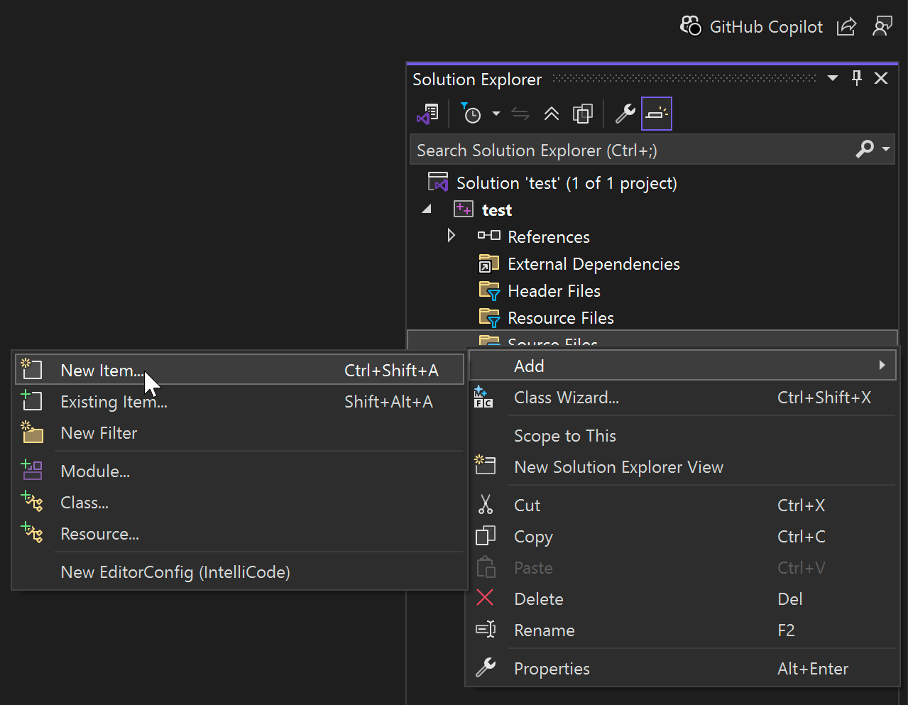 - Once the project has been created, in your solution, right click in "Source files" and choose "Add new file"